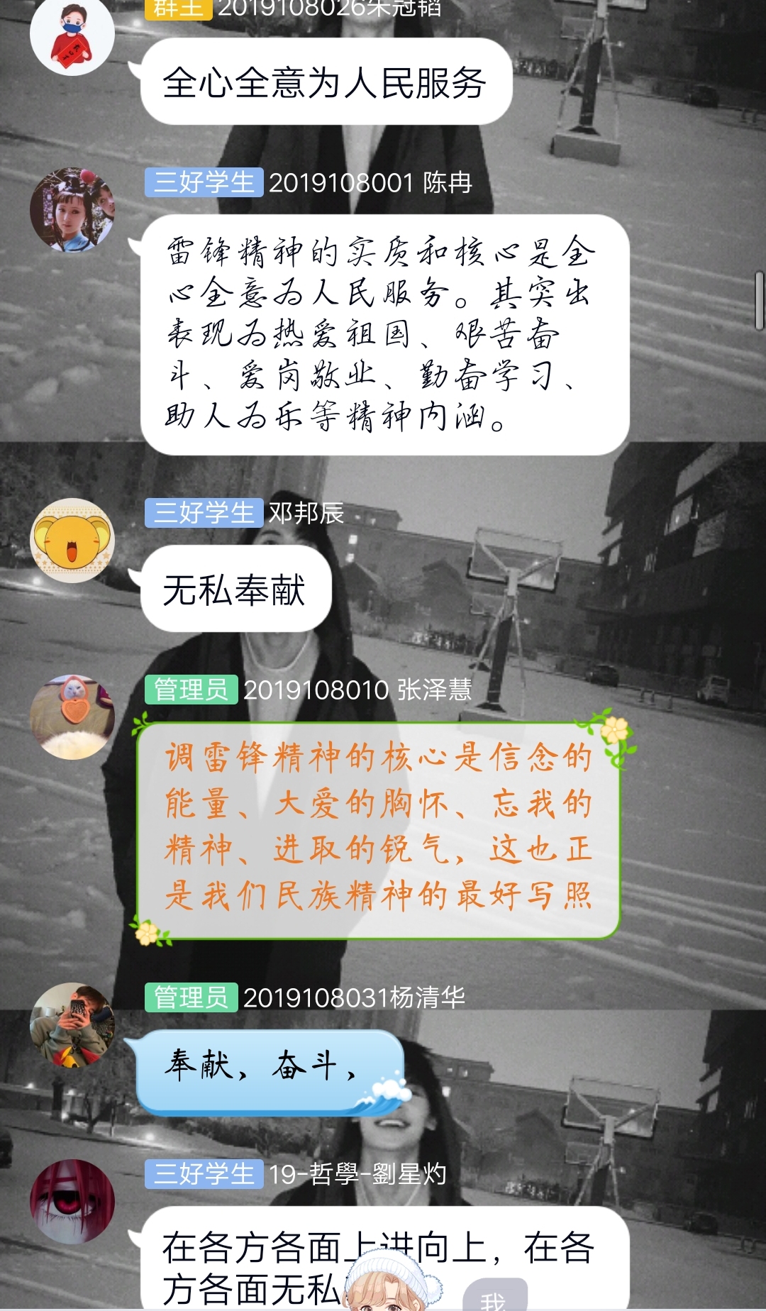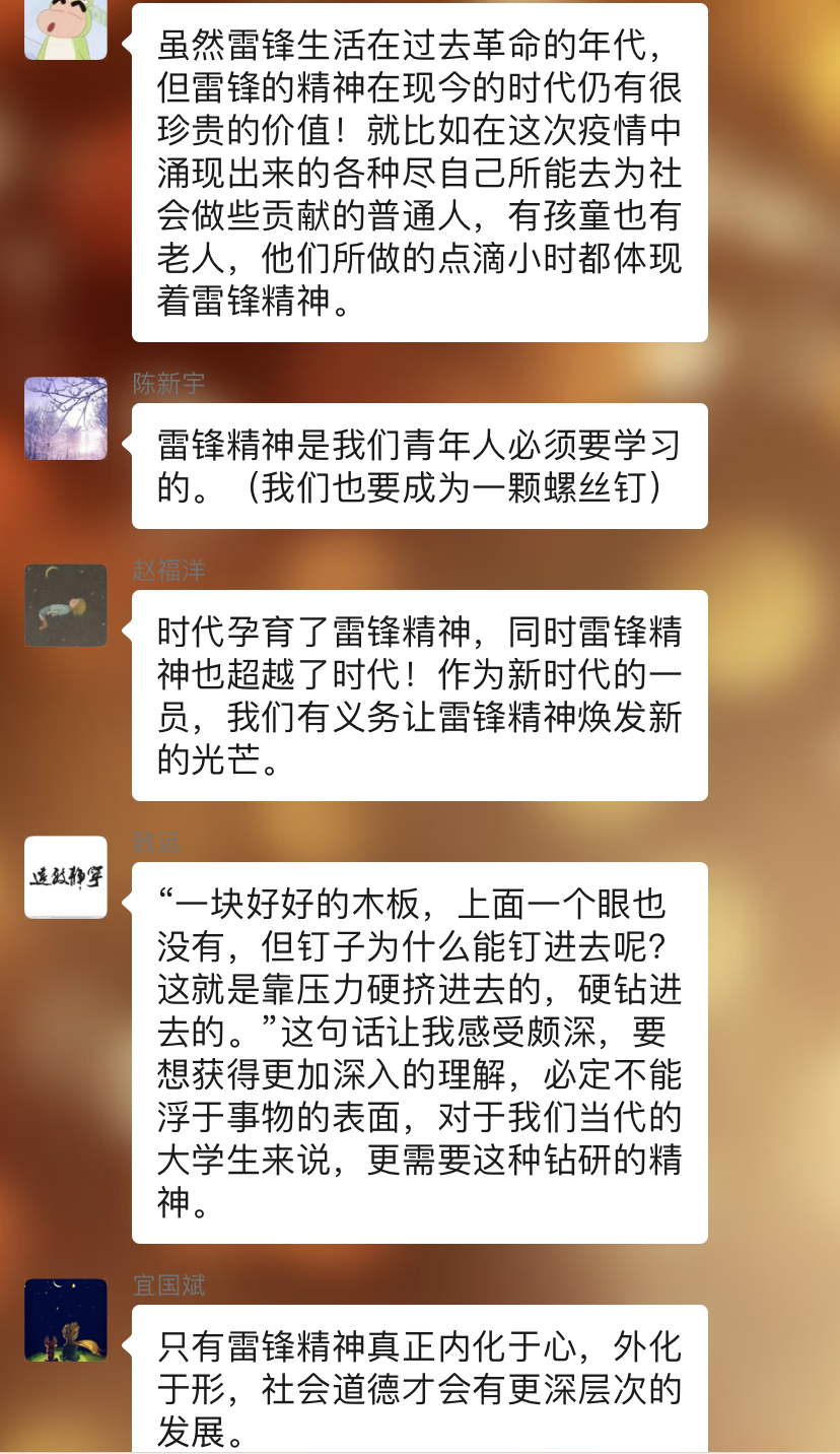 活动开始,在团支书的抛砖引玉下,同学们纷纷描述了自己眼中的“雷锋精神”,展示了自己对于“雷锋精神”的见解。接着,团支书分享了学习强国中《雷锋精神,点燃心灵的火种》和《读懂雷锋精神的永恒价值》两篇文章,同学们再仔细阅读后也纷纷积极分享了自己的感悟和体会。然后,团支书又在群中和大家分享表彰了韩欣怡和吴天歌两位同学在抗疫期间的先进事迹,展示证明了“活雷锋”就在我们的身边。同学们也纷纷表示了对这两位同学的赞美与钦佩。随后,许多同学也将自己身边发生的感人的“活雷锋”事迹分享在群中。